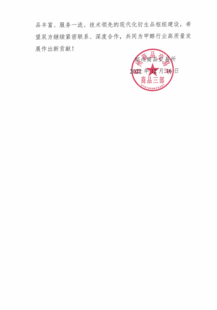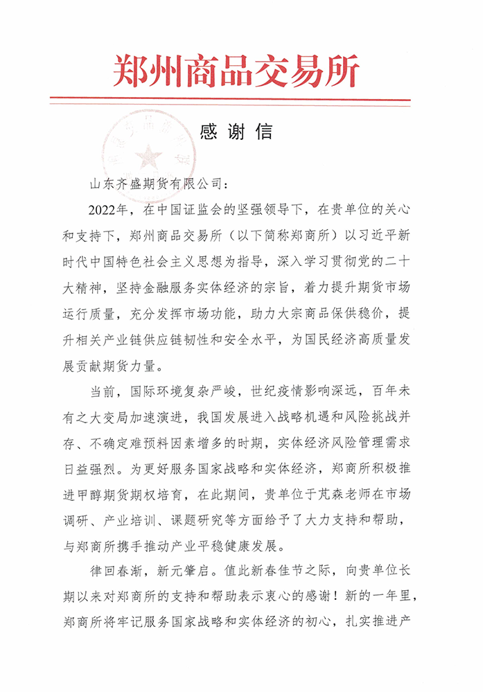 近日,山東齊盛期貨有限公司收到了鄭州商品交易所的感謝信。信中對(duì)2022年我司高級(jí)分析師于芃森在市場(chǎng)調(diào)研、產(chǎn)業(yè)培訓(xùn)、課題研究等方面給予了大力支持和幫助,為甲醇期貨相關(guān)工作的開展提供了有力保障表示了感謝,并一次性獎(jiǎng)勵(lì)我司2萬元資金。