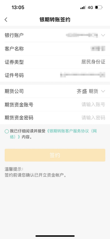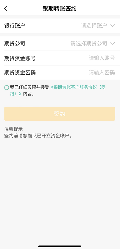 點(diǎn)擊“銀期轉(zhuǎn)賬簽約”,選擇預(yù)留在山東齊盛期貨公司的銀行賬戶(hù),期貨公司填寫(xiě)為“齊盛期貨”,填寫(xiě)“期貨資金賬號(hào)”和“期貨資金密碼”, 勾選“我已仔細(xì)閱讀并理解《銀期轉(zhuǎn)賬客戶(hù)服務(wù)協(xié)議》(網(wǎng)絡(luò))內(nèi)容”,點(diǎn)擊“簽約”。