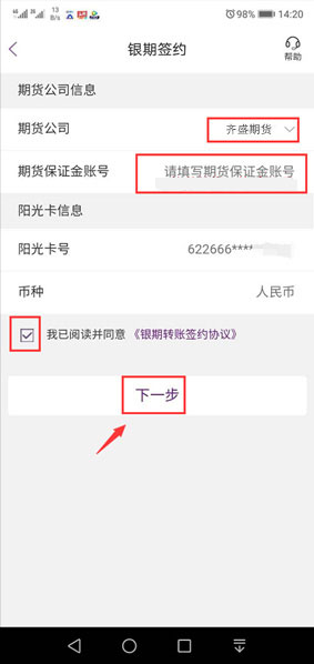 選擇期貨公司,輸入資金賬號(hào),勾選“我已閱讀并同意“,再點(diǎn)擊下一步。