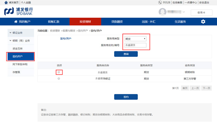 點擊簽約開戶,服務商類型選擇“期貨“,服務商名稱選擇”齊盛期貨“,并在底下選擇選項上勾選下,再點擊”簽約“。