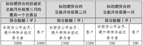 客戶持有的某月份期權(quán)合約所有看漲期權(quán)的買持倉量和看跌期權(quán)的賣持倉量之和、看跌期權(quán)的買持倉量和看漲期權(quán)的賣持倉量之和,分別不得超過下表所示的持倉限額。